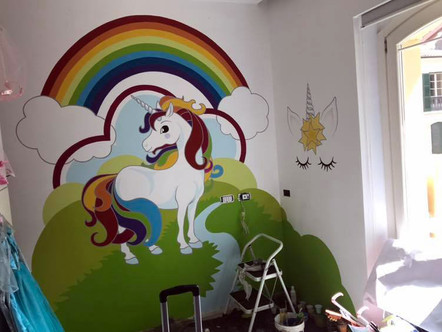 In questi 31 anni di attività posso dire di aver dipinto veramente di tutto, da opere super raffinate a strisce dei parcheggi (nei periodi di magra). Tutto ha contribuito a definirmi in senso artistico ed umano. Ecco che oggi arriva a far parte del portfolio esperienziale un Unicorno. Ogni tanto l’arte ci chiede di regredire. Gli occhi illuminati della bambina cui è destinata la decorazione mi ha ripagato in pieno della “fatica” di fare una cosa così elementare.